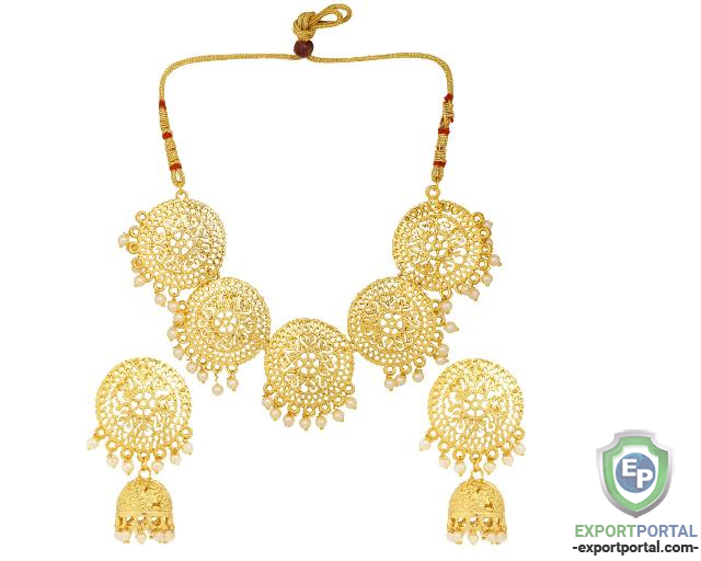 - Classic antique designer religious gold plated choker neckace set Lakshmi haar, Set Content: a) Necklace Length: 16" Inch x 1.4" Inch (40.6 cm x 3.5 cm) with an adjustable soft tassel closure, b) A pair of Earrings L x W: 2.8" Inch x 0.8" Inch (7.1 cm x 2.54 cm) Metal: Alloy.