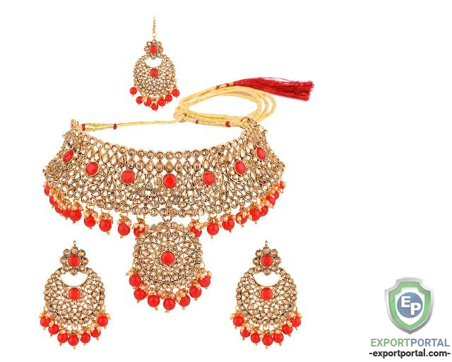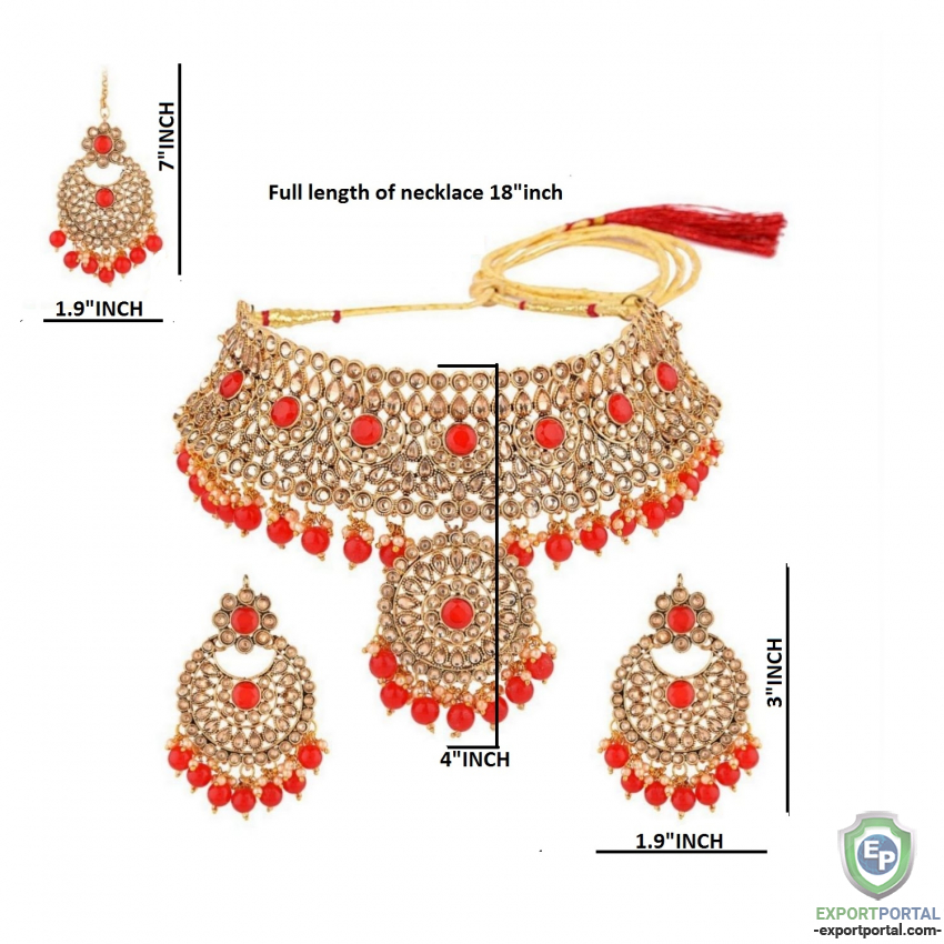 - Indian Traditional Jewelry Set, Content: a) 1 Necklace L x W: 18" Inch x 1.9" Inch (45.7 cm x 4.8 cm) with an adjustable soft tassel closure b) A pair of Earrings L x W: 3" Inch x 1.9" Inch(7.6 cm x 4.8 cm) & c) Mang tikka L x W: 7" Inch x 1.9" Inch(17.7 cm x 4.8 cm), Metal: Alloy.