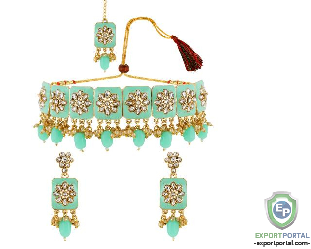 - Traditional Gold Plated Jewelry Set, Set Content: a) Necklace Length: 16" Inch x 0.9" Inch (40.6 cm x 2.54 cm) with an adjustable soft tassel closure, b) A pair of Earrings L x W: 2.8" Inch x 1" Inch (7.1 cm x 2.54 cm), c) Maangtikka L x W: 4.9" Inch x 1" Inch (12.44 cm x 2.54 cm), Metal: Alloy.