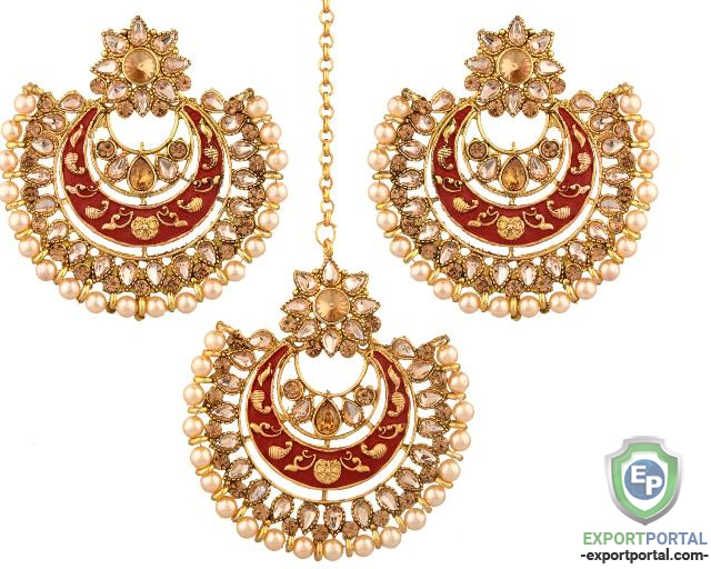 - Elegant delicate gold plated Indian wedding kundan jewelry set, maangtikka earrings set, Content: 1. Maang Tikka: L X W: 6.9" Inch x 2.9" Inch (18 cm x 7 cm), 2) Earrings: L x W: 3" Inch x 2.9" Inch (7 cm x 8 cm), Closure type: Push Back