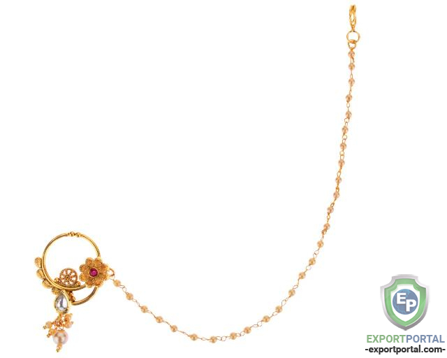 - Traditional antique delicate nose pin/ stud/ ring/ naath with chain, requires no piercing , clip on round open end, Nose hoop: L x W (from front): 1.7" x 1.1", Chain: L x W: 8.1" x 0.2".