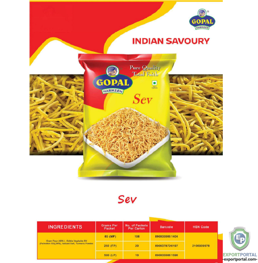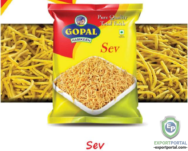 Sev is a popular Indian snack food consisting of small pieces of crunchy noodles made from chickpea flour paste, which are seasoned with turmeric, cayenne, and ajwain before being deep-fried in oil.