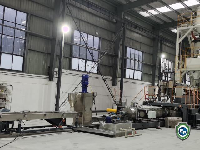 生产过程:进料系统-内部混合机-强制喂料机-双级造粒机-冷却和输送-产品均质化-计量称重-托盘堆垛