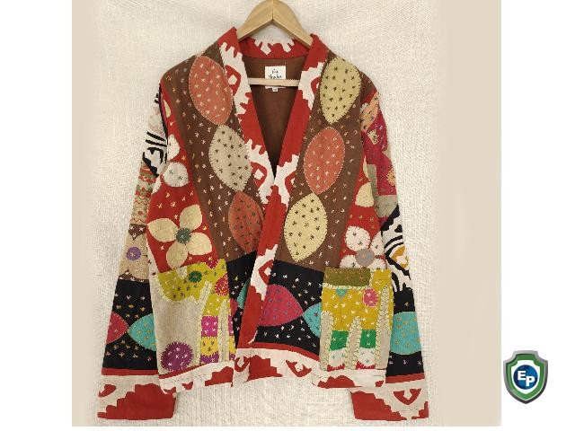 AN ANOTHER CHANCE Presenting Gorgeous Colourful Cut Work Vintage Applique Kantha Jacket. Jacket made with appliqué kantha quilt which is recycled and vintage. This is a jacket made by hand stitched from the quilt patches of recycled fabric and it is the specialty of this piece.